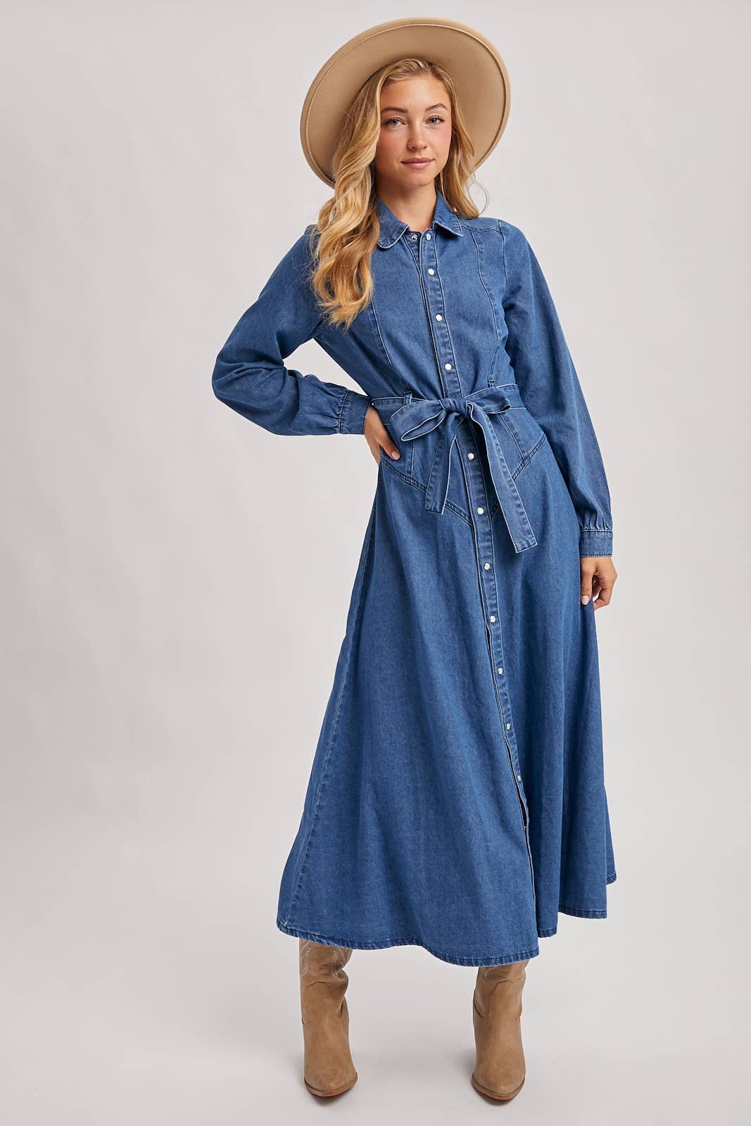 This is a long-sleeved, button-front denim shirt dress in a medium-blue wash with a flowing, A-line maxi skirt. It features a classic collar, distinctive western-inspired seaming on the bodice, and a matching self-fabric tie-belt to define the waist. The long sleeves are finished with slightly gathered, buttoned cuffs, adding a touch of softness to the structured design. The dress is styled with tan suede boots and a coordinating wide-brimmed hat, creating a sophisticated and modern western-inspired look. To find something similar, search for "long sleeve denim maxi shirt dress" or "western style denim dress."